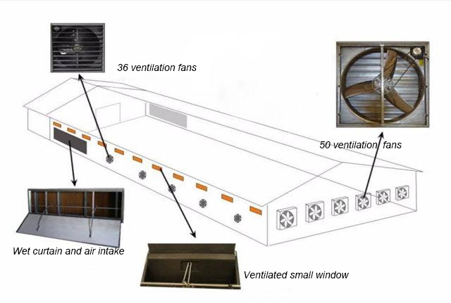 Клетка для кур-несушек типа H вентиляция и система охлаждения. автоматическая вентиляция и система охлаждения является базовым проектом по реализации автоматизации клеточное оборудование для ярусных несушек. Поскольку куры-несушки с высокой плотностью выращивания выращиваются в полностью закрытом птичнике, климат в птичнике контролируется автоматической системой вентиляции и охлаждения.Курятник можно установить с вентиляторы и мокрые шторы для обеспечения качества воздуха в птичнике.Если автоматическая система вентиляции и охлаждения не подходит, это окажет большое влияние на производство куриного стада.По этой причине проектирование автоматической системы вентиляции и охлаждения должно осуществляться с учетом климатических условий местного хозяйства.